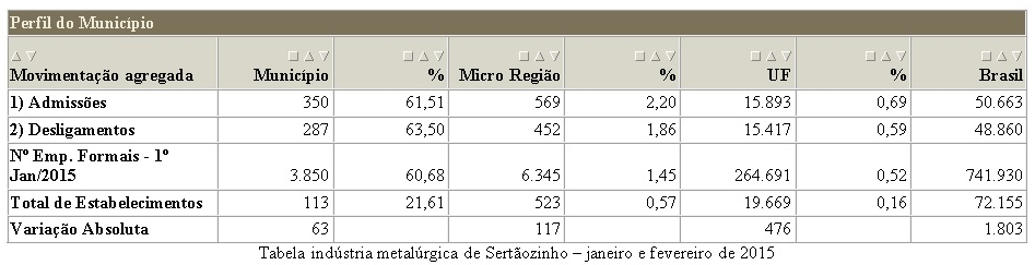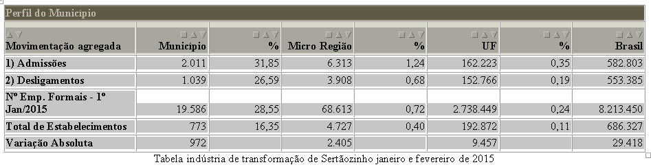 Já em 2015, nos dois primeiros meses, mesmo com toda crise econômica brasileira, a indústria de transformação da região de Sertãozinho fecha com saldo positivo, tendo sido contratados 2011 novos funcionários e demitidos 1039, totalizando 972 novos postos de trabalho.
